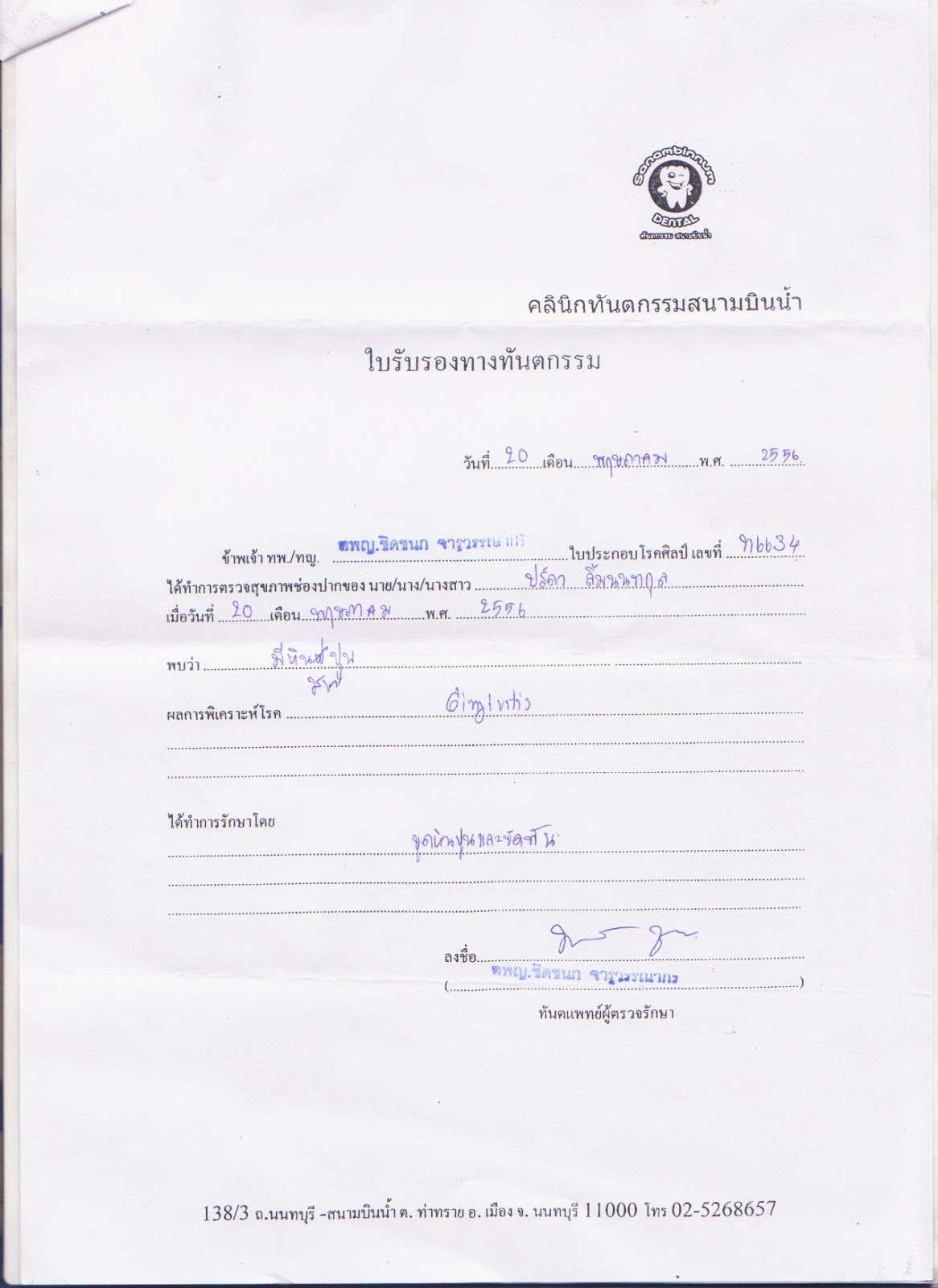 ตอนนี้สภาพฟันโดยรวม สุขภาพฟันดีปานกลาง มาหาคุณหมอเป็นประจำ มีล่าสุดทิ้งช่วงไป 1 ปีครึ่ง แต่ก็จะกลับมาหาให้ตรงเดือนมากขึ้น มารักษาดูแลแต่ละครั้งก็ไม่พ้น ขูดหินปูน เคลือบฟลูออไรด์ เป็นส่วนใหญ่ ผมนำใบเสร็จค่ารักษา มาให้ดูด้วย และอย่าลืมขอใบรับรองแพทย์ด้วยนะครับ เพราะนำไปเบิกประกันสังคมได้ครับ